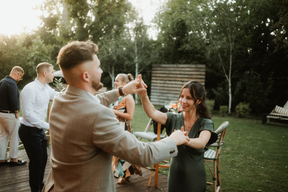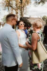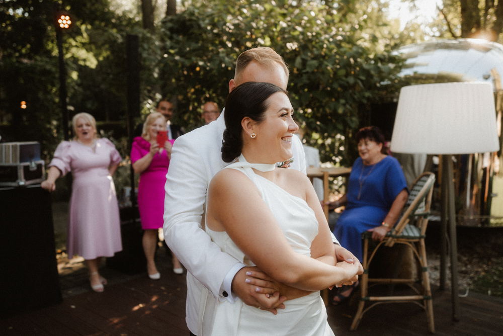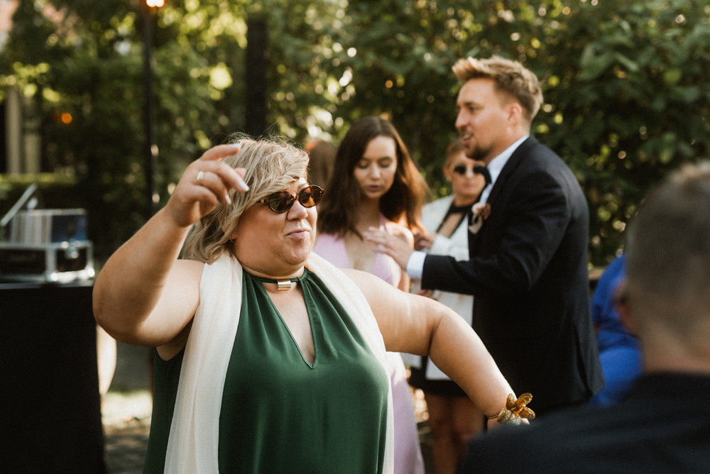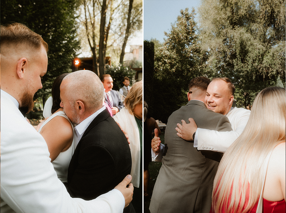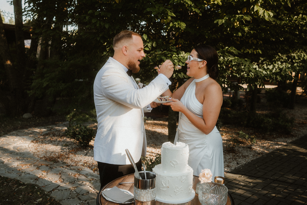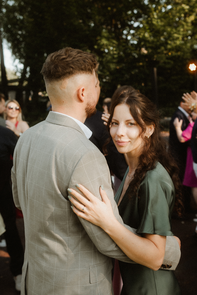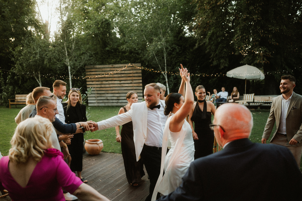 W tych fotografiach to drobne gesty budują całą opowieść. Zobaczcie uśmiech wymieniony nad kieliszkiem szampana czy dłonie splecione przy wspólnym stole. Ciekawym elementem były też swobodne rozmowy w ogrodzie, to właśnie jest kwintesencja quiet luxury. Styl, który niczego nie udowadnia, a po prostu podkreśla osobowość Pary Młodej.