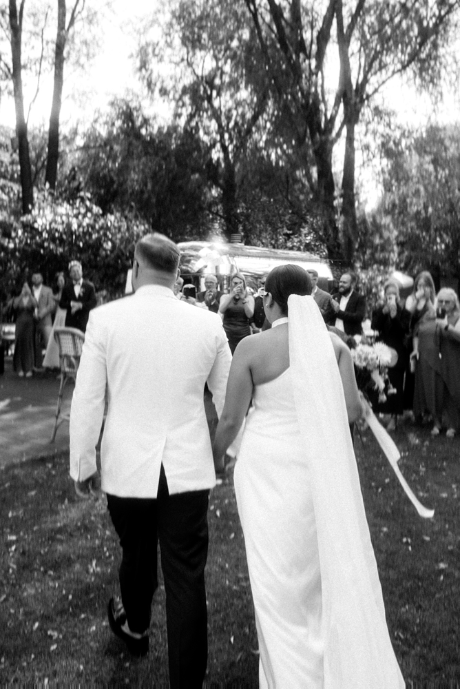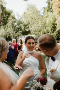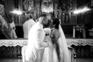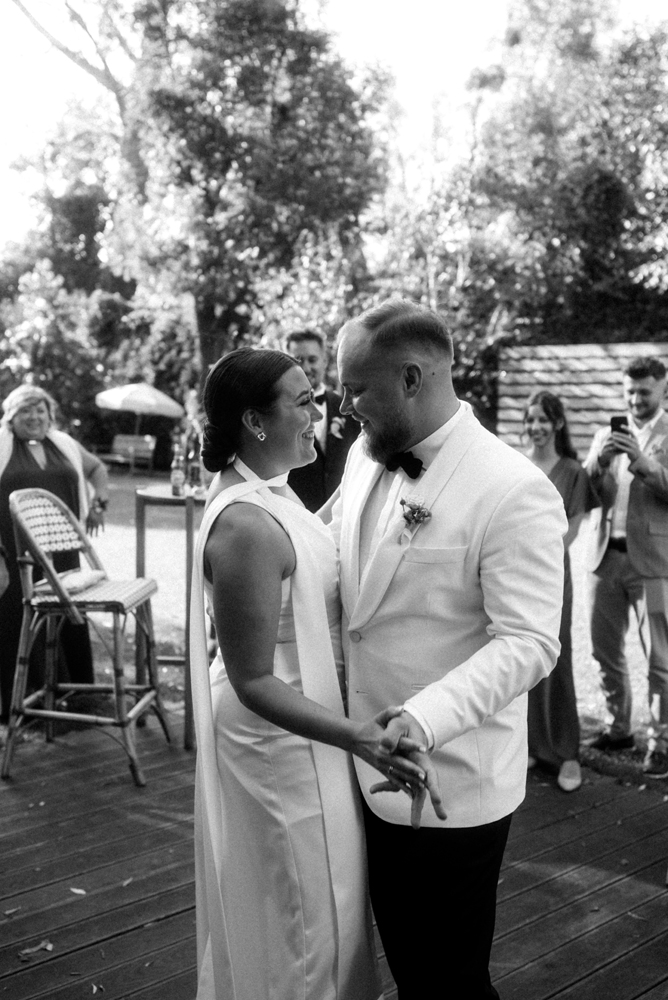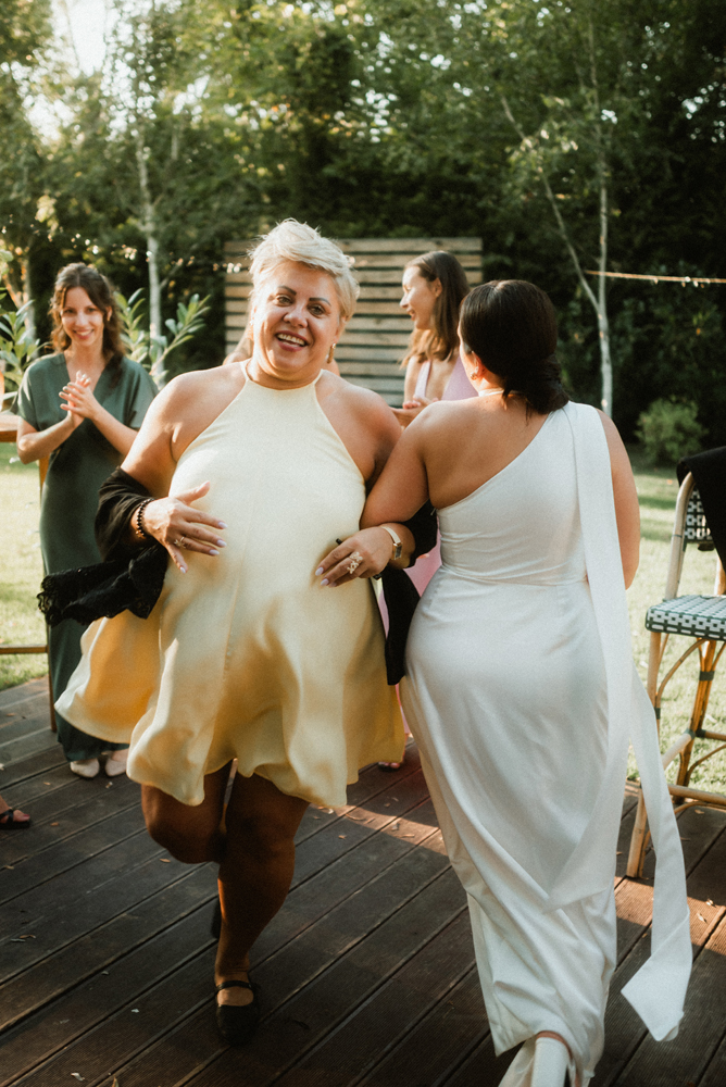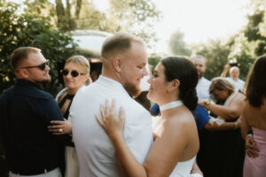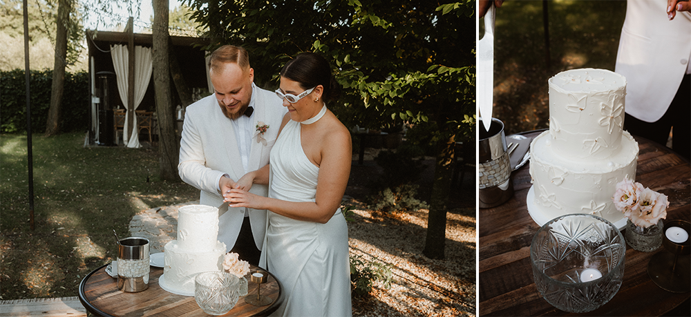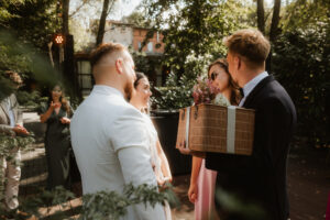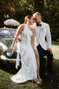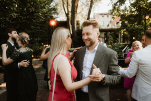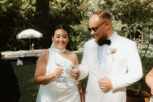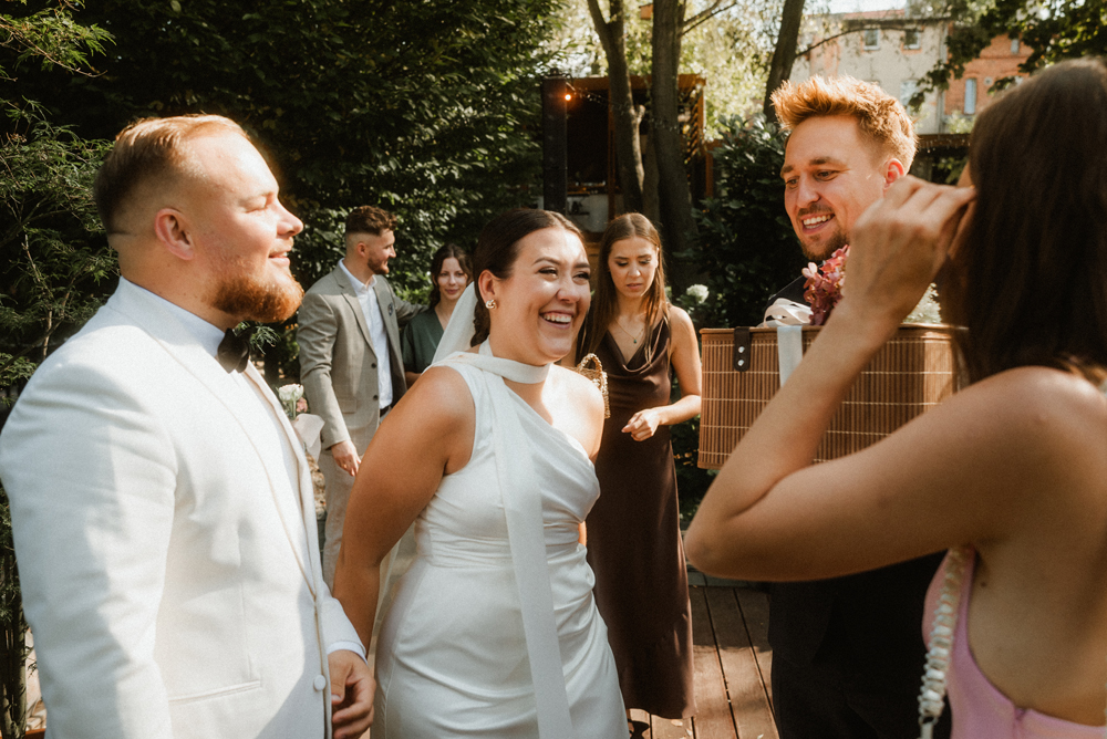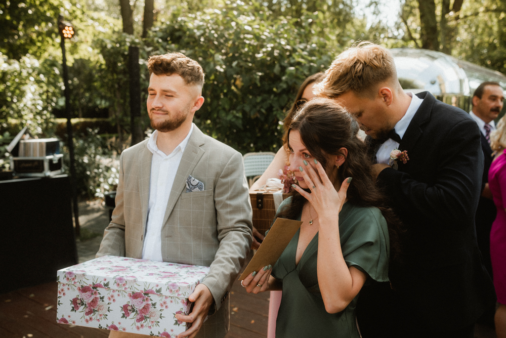 W tych fotografiach to drobne gesty budują całą opowieść. Zobaczcie uśmiech wymieniony nad kieliszkiem szampana czy dłonie splecione przy wspólnym stole. Ciekawym elementem były też swobodne rozmowy w ogrodzie, to właśnie jest kwintesencja quiet luxury. Styl, który niczego nie udowadnia, a po prostu podkreśla osobowość Pary Młodej.